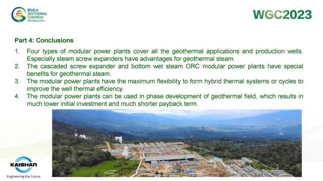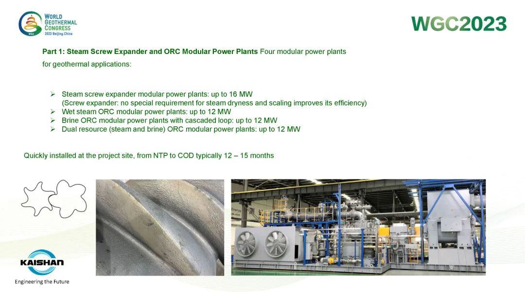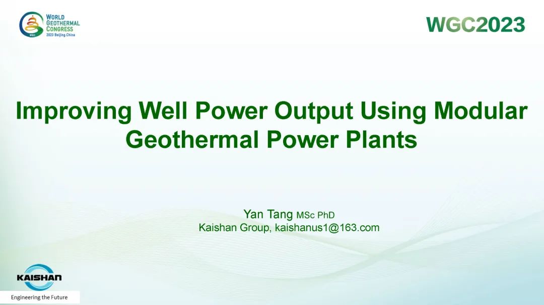 9月16日,公司總經(jīng)理、開山地?zé)峋谀K發(fā)電技術(shù)創(chuàng)始人湯炎博士參加2023年北京世界地?zé)岽髸╓GC),并受國際地?zé)釁f(xié)會(IGA)首席執(zhí)行官M(fèi)arit Brommer女士邀請,做了題為《使用地?zé)崮K電站提高地?zé)峋a(chǎn)量》(Improving Well Power Output Using Modular Geothermal Power Plants)的專題報(bào)告。