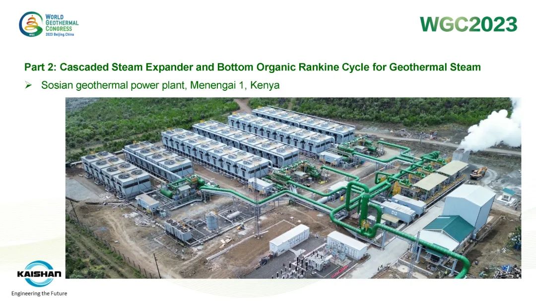 湯炎博士著重介紹了由開山EPC建設(shè)的肯尼亞Sosian-Menengai地?zé)犭娬炯伴_山自主開發(fā)、建設(shè)、運(yùn)營的Sorik Marapi地?zé)犭娬境晒Π咐?。Sosian-Menengai地?zé)犭娬静捎谩罢羝蛎洐C(jī)+濕蒸汽ORC膨脹機(jī)”模塊電站串級循環(huán),無需采用傳統(tǒng)中央電站分離不凝性氣體的蒸汽噴射器和真空泵,從而降低了電站寄生負(fù)荷、提高其發(fā)電效率。Sorik Marapi項(xiàng)目是公司各類型模塊電站的集大成者,高壓蒸汽井、低壓蒸汽井、熱水井熱源均可得到充分利用,進(jìn)而使項(xiàng)目實(shí)現(xiàn)“無閑置低壓/低溫井”。模塊電站“量體裁衣”式的解決方案通過提高井熱效率改善了地?zé)衢_發(fā)的經(jīng)濟(jì)性,也通過獨(dú)樹一幟地有效利用低壓地?zé)峋盁崴?,顯著降低了資源鉆探的單位成本。