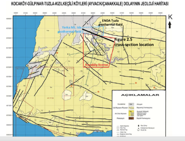 Transmark GPP項(xiàng)目位于Biga半島;北安塔利亞斷裂區(qū)南段、Kestanbol斷層系統(tǒng)的移動主導(dǎo)了區(qū)域內(nèi)由地?zé)峤Y(jié)構(gòu)控制的滲透性,建立深層、高溫的地?zé)崃黧w帶至淺層的熱循環(huán)。項(xiàng)目所在的恰納卡萊省有超過5個投運(yùn)和開發(fā)中的地?zé)犴?xiàng)目。